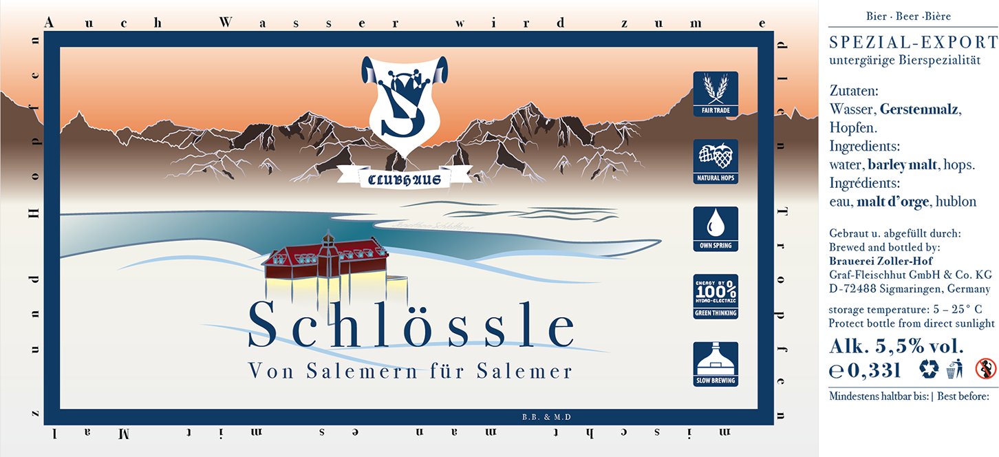 Dieses Etikettendesign entstand für eine Bierflasche und wurde für das 100-jährige Jubiläum meiner Schule angefertigt. Dabei inszeniert das Etikett das Gebäude der Schule vor der Kulisse des Bodensees mit den Alpen im Hintergrund und wurde mit großer Detailverliebtheit angefertigt.
